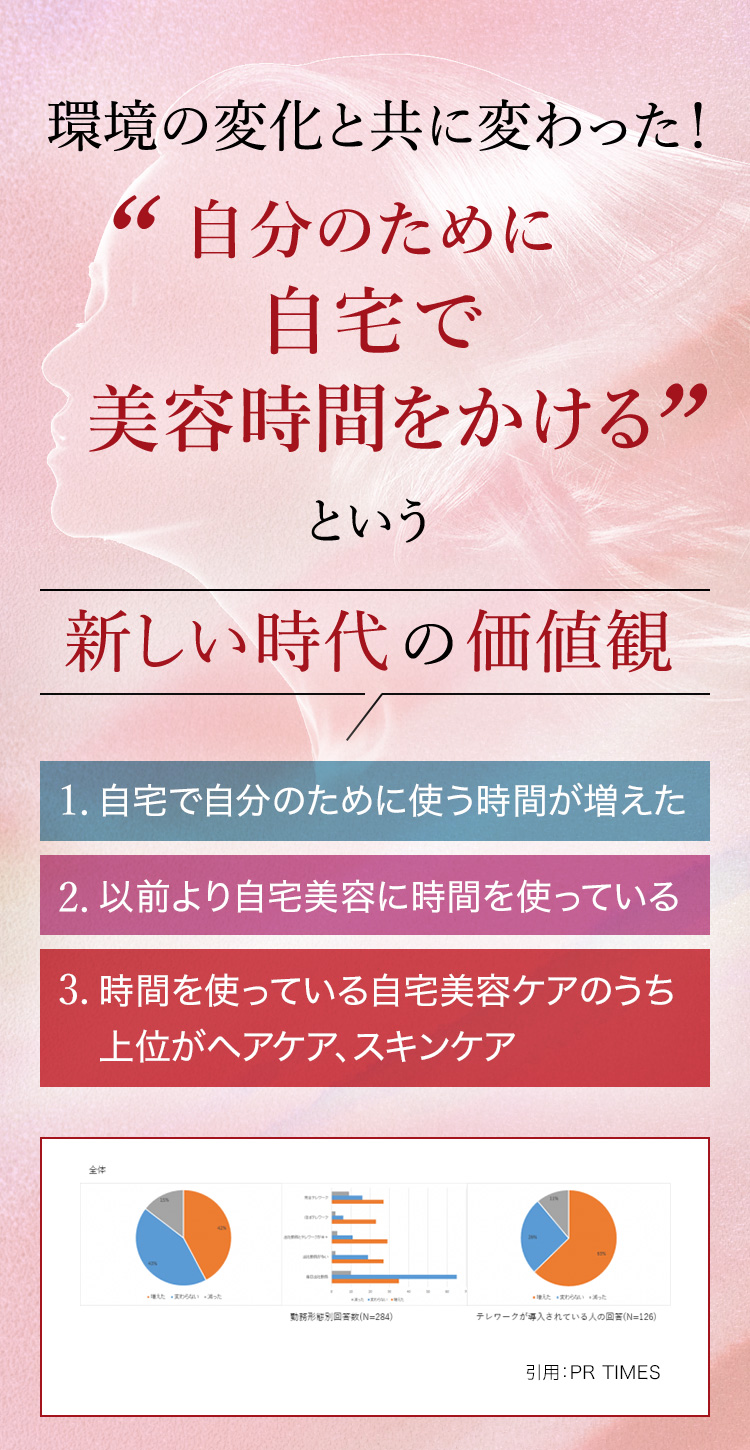 コロナで生活様式が変化してから、自宅で自分のために使う時間が増えたと答えた人42%。うち、リモートワークが導入されているグループでは、「増えた」との回答が増加。63%が自分のために使う時間が増えたと回答(N=500)。自分への時間が増えたという回答者のうち、時間をかけた美容ケアへ時間を使っていると答えた人が3割。その内訳は、フェイス、ボディ、そしてヘアケアが上位に。確実に美容への取り組み方が変わっていく。